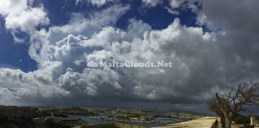Formation of vertical cloud extension with clear cirrus-like features at the top properly cumulonimbus capillatus praecipitatio because of a heavy shower falling underneath it. Heavy showers on this day were mostly in the Malta Channel because the small cold drop was located over Sicily. The first thumbnail shows a closer view of the cloud with a heavy shower clearly seen on the left hand side of the background. The third thumbnail shows the weather sounding at the time being clearly unstable through the air was relatively dry hence the relative lack of cloud cover. The fourth thumbnail clearly shows a very small cold pool of air over Catania which led to a very small low pressure system hence clouds circulating around this very small low pressure system. In Autumn such small cold pool of air normally triggers severe thunderstorms with heavy rainfall but due to Spring conditions, this only led to relatively meager and few cumulonimbus clouds. Having said this, over land, the day was characterized by mostly cumulus mediocris clouds as shown in the second thumbnail because the airmass was not that much unstable over mainland Malta due to its cold centre being slightly father north from the area.